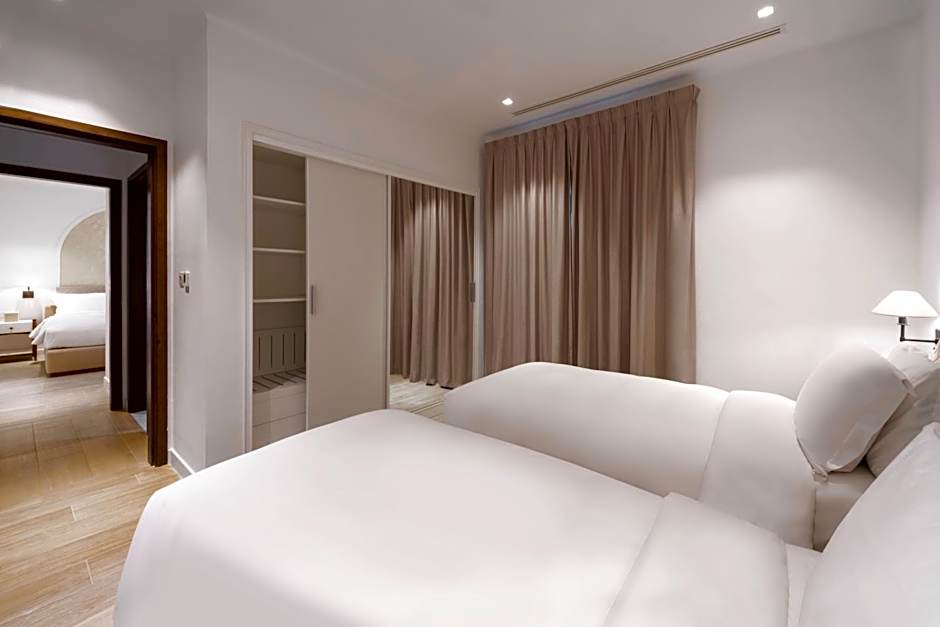 Accommodation choices range from intimate studios to grand multi-bedroom configurations. The Sea View Apartment at 2,153 sqft sleeps up to 10 adults and 9 children, with a Queen bed plus eight Twin beds. Other options include the Superior Suite, Sea View (969 sqft) for 2 adults and 1 child; Apartment, 2 Bedroom (1,453 sqft) for 3 adults and 1 child; Apartment, 3 Bedroom (1,884 sqft) for 5 adults and 5 children; Executive Suite (1,722 sqft) for single use or larger groups; along with various Deluxe and other suites and houses. All listed accommodations are non-smoking.